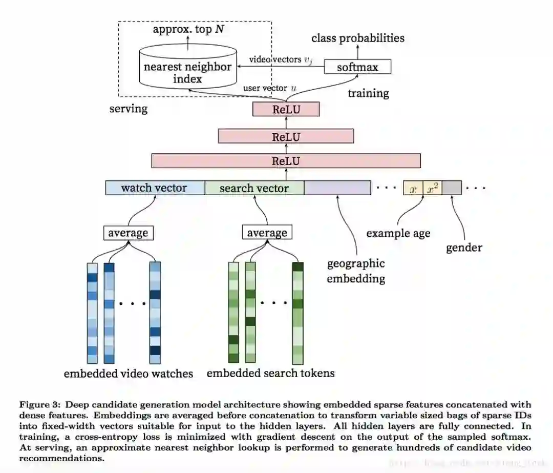 上图是YouTube初排模型的图示。具体的流程为:首先通过nlp技术,如word2vec,预训练出所有物品的向量I表示;然后对于每一条用户对物品的点击,将用户的历史点击、历史搜索、地理位置信息等信息经过各自的embedding操作,拼接起来作为输入,经过MLP训练后得到用户的向量表示U;而最终则是通过 softmax 函数来校验U*I的结果是否准确。