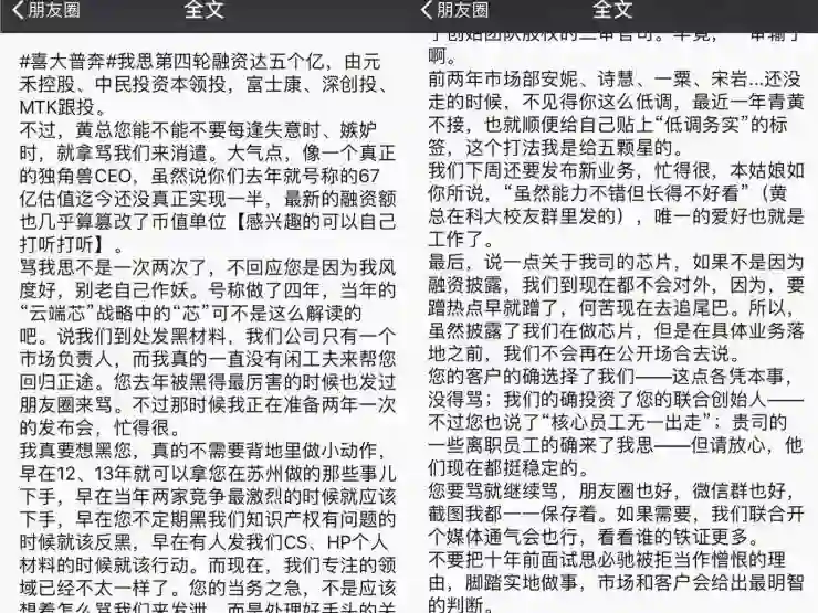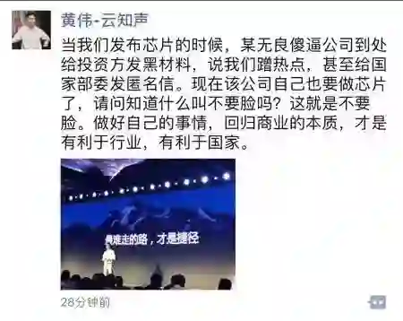 黄伟写道:“当我们发布芯片的时候,某无良傻逼公司到处给投资方发黑材料,说我们蹭热点,甚至给国家部委发匿名信。现在该公司自己也要做芯片了,请问知道什么叫不要脸吗?这就是不要脸。做好自己的事情,回归商业的本质,才是有利于行业,有利于国家。”