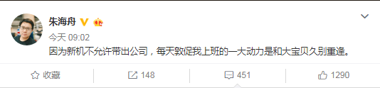8月12日,锤子科技产品经理朱海舟突然在其个人微博透露了锤子新机的最新进展,令人猝不及防。朱海舟表示新机已经出来了,因为保密或是其它原因存放在公司当中,目前不允许带出公司,他表示“每天敦促我上班的一大动力是和大宝贝久别重逢”。