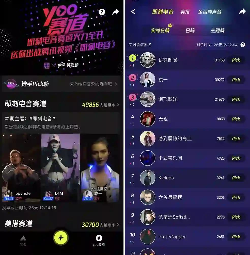 就内容本身而言,主要是UGC和PGC内容,而微视是UGC为主。入驻的达人主要有明星、各个领域的KOL等。值得一提的是,有视频突出了赛道和选手pick榜的玩法,目前有即刻电音、美搭、金话筒声音等赛道,用户可以进入各个赛道为喜欢的选手投票。其中,即刻电音有近5万人投票。而且36氪也注意到,即刻电音的优秀选手有可能参与腾讯视频的《即刻电音》节目。