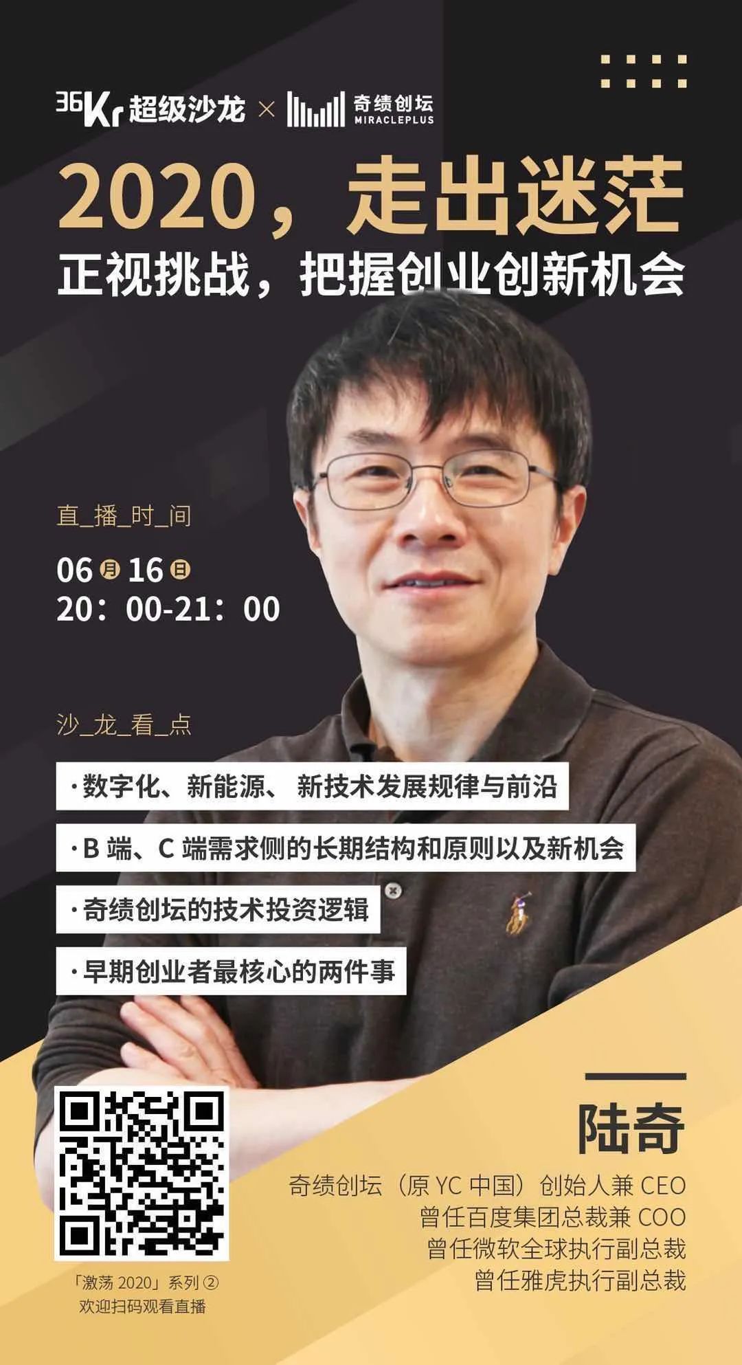 2020年,对于企业来说,是风云激荡的一年。变数、动荡、挫折,企业如何走出迷茫,正视挑战?2020年有哪些创业创新的机遇值得把握?超级沙龙「激荡2020」系列第二期,邀请奇绩创坛创始人兼CEO陆奇一一解答。