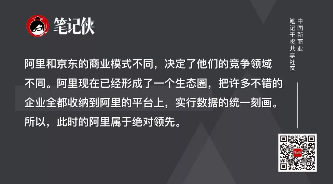 这个生态圈,把许多不错的企业全都收纳到阿里的平台上,实行数据的统一刻画。所以此时的阿里属于绝对领先,而京东还没有显示出现这样的优势。