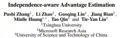 当环境中存在独立性时,优势函数的估计就不需要考虑环境中的部分奖励,从而使得估计中的方差减小。举个例子:假设智能体当前的任务是打乒乓球,在该环境下,智能体每赢得一分或输掉一分后,游戏的状态都会被重新设置到起始状态,并继续进行下一轮游戏。当对智能体每一个动作的优势函数进行估计时,由于智能体每个动作的影响都被限制在当前回合内,所以下一轮及之后的奖励实质上不影响优势函数的估计。
