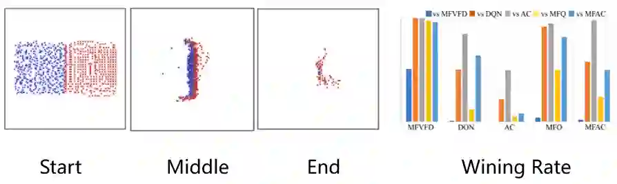 在主试验部分,研究员们选取了 MAgent Battle 任务,对 MFVFD 在具有大规模智能体且具有部分观测的限制下的性能进行了验证。在该任务中,红蓝双方各具有400个智能体,每个智能体具有局部观测,且无法通讯,其通过消灭敌人来获得奖励。由于每个智能体以优化各自的奖励为目标,所以单体会与同伴竞争杀敌数量,来获取更多的个人奖励。除此之外,单体还会与同伴配合避免被杀害,以消灭所有敌人获取更多的团队奖励。因此,这是一个合作和竞争混合的复杂任务。如图3所示,MFVFD(红色)与基线方法的(蓝色)相比,学会了更难的团体配合的围歼策略,取得了胜利。从对抗胜率上可以看出,MFVFD 在所有的基线方法中,几乎处于不败地位。