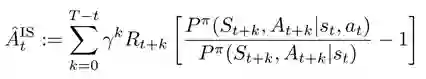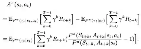 上述例子表明,如果执行当前的动作不影响未来某些状态的概率,那么这些未来状态上的奖励在估计优势函数时就可以被忽略。研究员们对上述观察进行了概括和抽象,并提出了基于重要性采样的优势函数估计量。下面给出的是基于重要性采样推导出来的该估计量的形式: