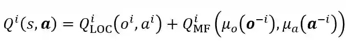 为了研究多智能体如何在既有合作又有竞争的环境下的表现,研究员们基于平均场理论将个体在多智能体系统中基于全局信息的动作值函数,近似为基于局部信息估计的个体动作值函数与基于近邻信息的平均场影响函数的和,公式如下: