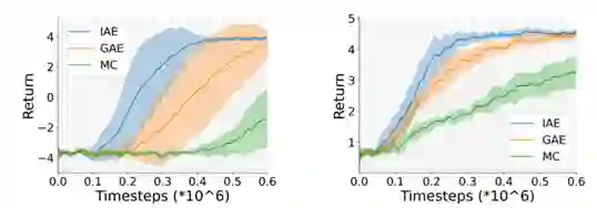 在该方法中,存在于环境中的独立性可以用来构建一个基于重要性采样 (importance sampling) 的优势函数估计量。该估计量可以忽略未来无关的部分奖励,从而减小估计中的方差。为了进一步减少优势函数估计的方差,研究员们把该估计量和已有的蒙特卡洛估计量进行融合,并将最终的优势函数估计量命名为 IAE (Independence-aware Advantage Estimation)。实验结果表明,在策略优化算法中,IAE 与现有的优势函数估计方法 (GAE, MC) 相比,达到了更高的样本利用率。