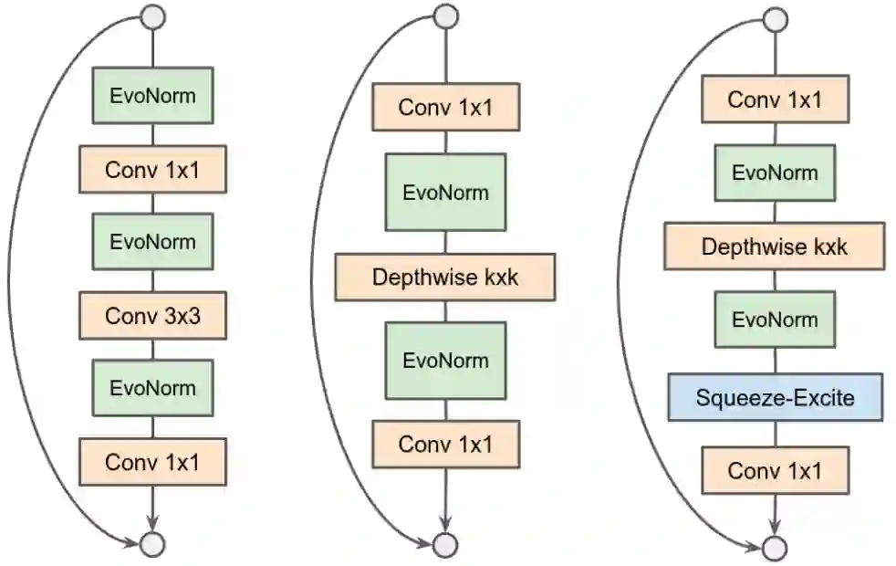与只依赖一种方差的传统归一化范式不同,EvoNorm-B0 尝试在其 denominator 中混合两种方差。前者在同一 mini-batch 内捕捉不同图像的全局方差,后者则捕捉每个图像的局部方差。