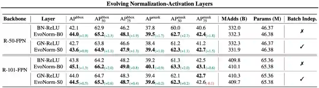 实验证明,EvoNorms 不仅在包括 ResNets、MobileNets 和 EfficientNets 在内的多个图像分类模型上效果显著,它还能很好地迁移到 Mask R-CNN 模型(进行实例分割)和 BigGAN(用于图像合成)。在多种情况下,EvoNorms 的性能显著优于基于 BatchNorm 和 GroupNorm 的层。
