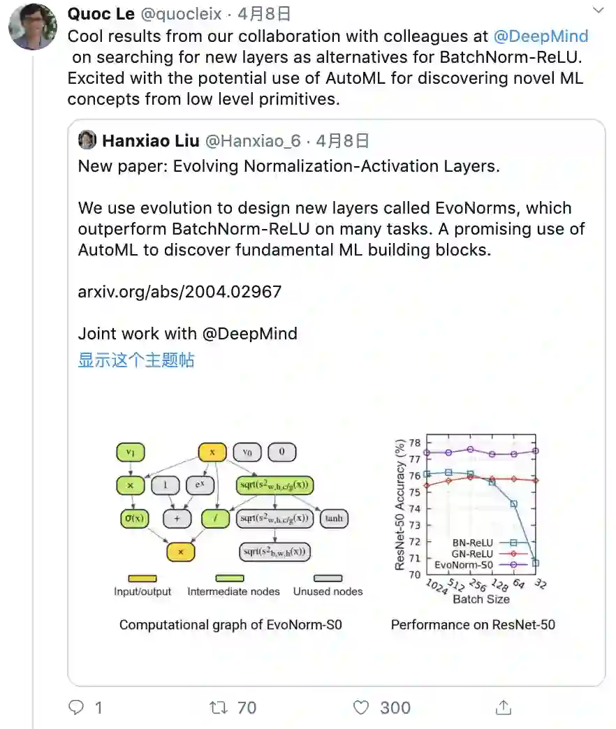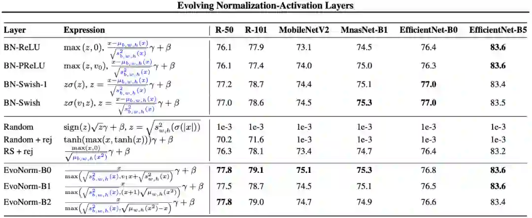 最近,谷歌大脑团队和 DeepMind 合作发布了一篇论文,利用 AutoML 技术实现了归一化激活层的进化,找出了 BatchNorm-ReLU 的替代方案 EvoNorms,在 ImageNet 上获得 77.8% 的准确率,超越 BN-ReLU(76.1%)。