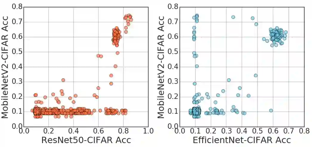 研究者将代理任务定义为在 CIFAR-10 数据集上的图像分类任务,并考虑在 ImageNet 上三个具有代表性的网络架构,将其针对文中的设置进行相应调整。这些架构包括:通道倍率(channel multiplier)为 0.25×的预激活(Pre-activation)ResNet50;通道倍率为 0.5×的 MobileNetV2;通道倍率为 0.5×的 EfficientNet-B0。