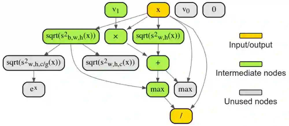 研究者将每个归一化-激活层表示为一个计算图,即将输入张量转换为同样形状的输出张量(见图 1)。每个中间节点表示一元或二元运算(见表 1)。这些运算旨在保存输入张量的维度,以确保计算图中节点的形状彼此兼容。计算图共有 4 个初始节点:输入张量、常数零张量,以及沿着被初始化为 0 和 1 的通道维度的两个可训练向量 v_0 和 v_1。