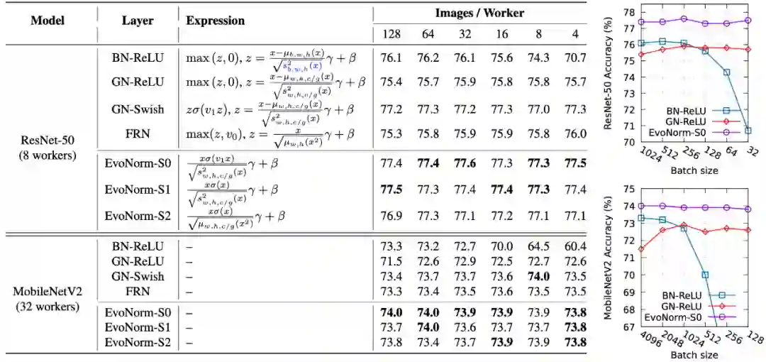 图 1:左图:搜索到的归一化-激活层的计算图,该层独立于批统计量,研究者将其命名为 EvoNorm-S0。右图:使用 EvoNorm-S0 作为归一化-激活层的 ResNet-50,当 8 个 worker 上的批大小从 1024 到 32 不等的情况下,在 ImageNet 数据集上的性能结果。EvoNorm-S0 的性能还优于 MobileNetV2 和 Mask R-CNN 模型中基于批归一化(BN)和组归一化(GN)的层。