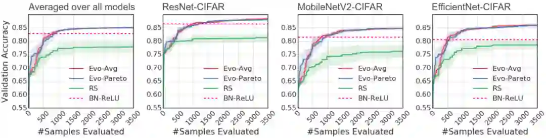 图 10:在代理任务中,进化 vs 随机搜索 vs 固定基线(BN-ReLU)的搜索进程。