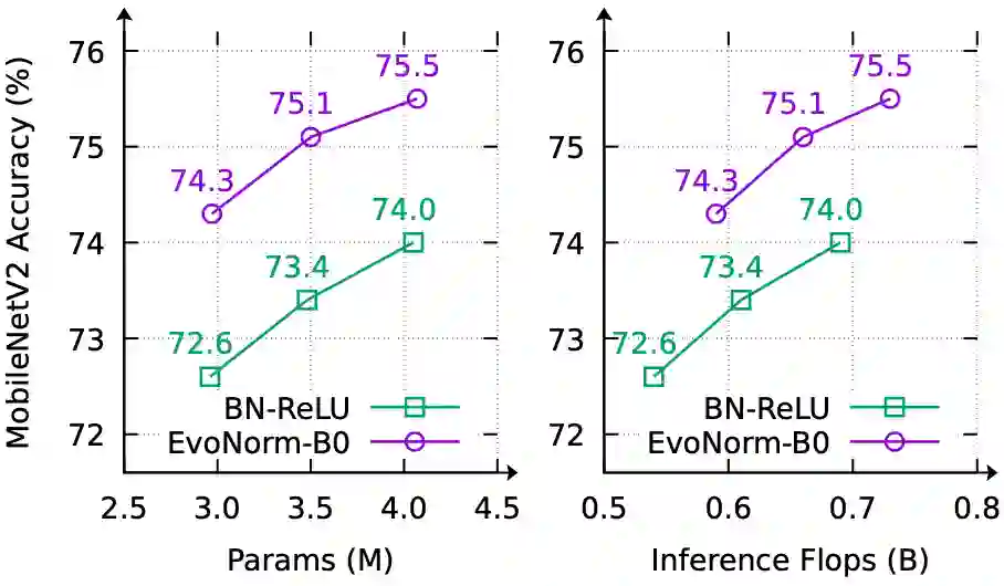 研究者以 MobileNetV2 为例详细研究了上述问题。结果显示,EvoNorm-B0 在准确率-参数权衡和准确率-FLOPs 权衡方面都显著优于 BN-ReLU(见图 11)。这是因为 EvoNorms 的开销可以很大程度上由其性能收益来补偿。