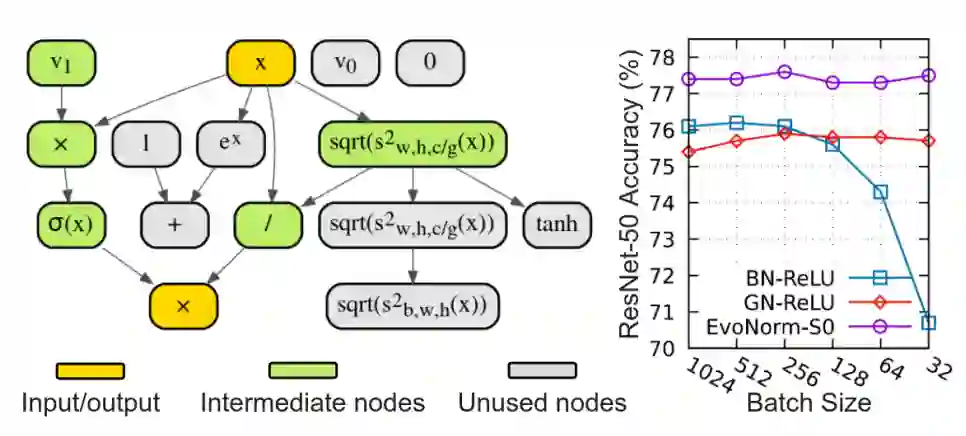 将二者统一为一个计算图,从低级原语开始进行结构进化。研究者利用层搜索算法发现了一组全新的归一化-激活层 EvoNorms