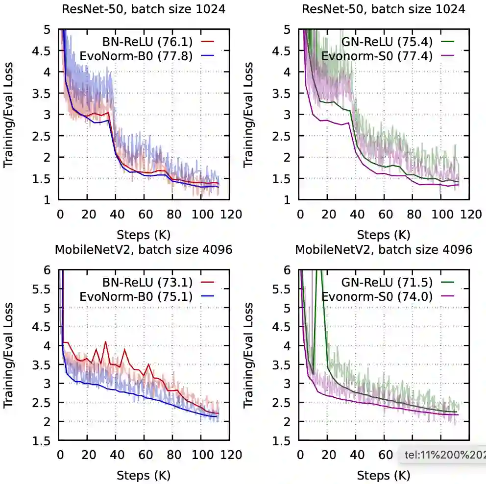 图 7 展示了具备大批量的 Evonorms 的学习动态。在相同的训练环境下,尽管训练损失较大,但在 ResNet-50 上 EvoNorm-B0 的性能仍然优于 BN-ReLU。