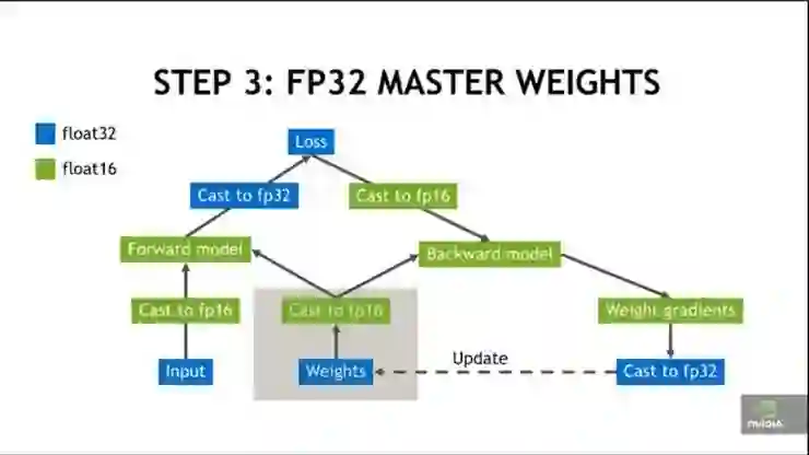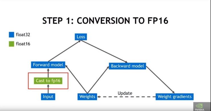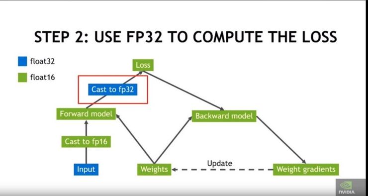 先用 FP32 张量进行权重更新,然后再换回 FP16 进行前向与反向迭代。