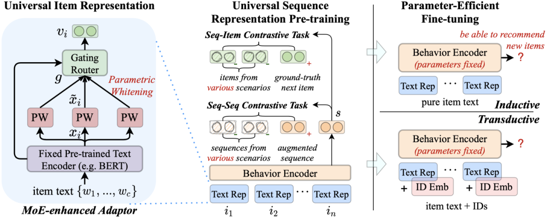 我们的做法是基于商品文本学习可迁移的商品表示,是通过自然语言描述了商品的特性。越来越多的证据显示,自然语言提供了一个通用的数据格式,可以连接不同的任务和领域。受此启发,我们首先使用预训练语言模型(PLM)学习文本表征。进一步,由于不同领域的文本表征可能会形成不同的语义空间(即使文本编码器相同),我们提出使用参数白化网络和混合专家网络(MoE)增强的适配器模块来将原始的文本表示转换至适用于推荐任务的通用的语义空间。