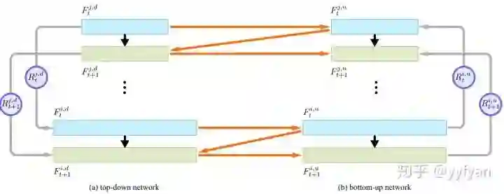 PANet在FPN的基础上加入bottom-up结构有效地传播P2的定位信息到其他层,结构与top-down结构基本一致。