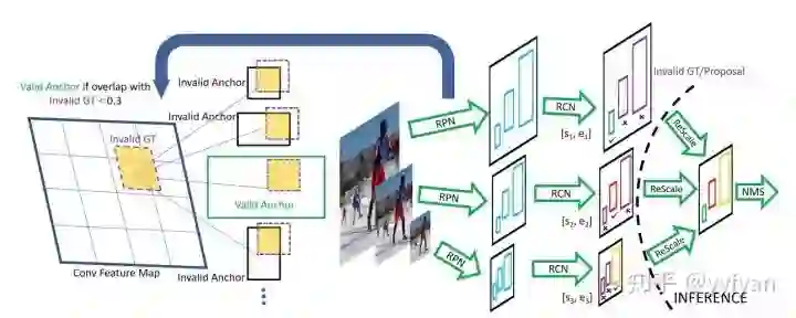 训练类似于SNIP,三个分支分别采用不同尺度的目标训练。