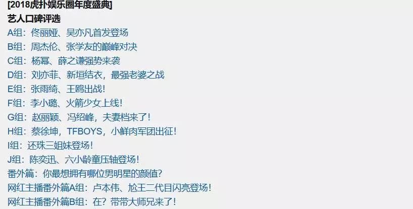 值得注意的是,2018年虎扑步行街关于娱乐圈的票选活动相比往年数量要多,涉及的种类也更加丰富。上文提到的2018年虎扑娱乐圈年度盛典艺人评选绝不仅限于最不受欢迎男艺人,该评选涵盖了最受欢迎男、女艺人;最不受欢迎男、女艺人;年轻男、女艺人口碑榜;虎扑争议最大男、女艺人;虎扑娱乐圈情侣口碑榜单;网红男、女主播。