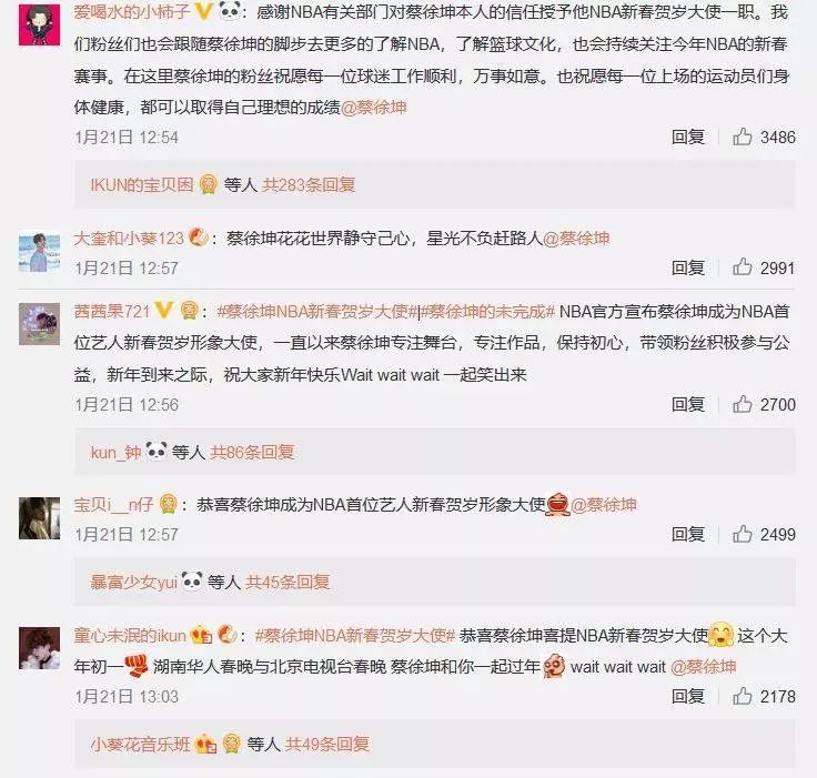 蔡徐坤担任“NBA新春贺岁大使”的微博评论截图