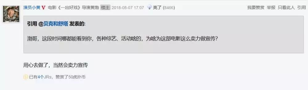 2018年8月7日,演员黄渤到虎扑社区宣传自己的电影《一出好戏》。注册ID为“演员小黄”,开贴:“JRs们大家好,我是小黄!今天终于有机会在这里和JRs们聊天啦。另外,我的导演处女作电影《一出好戏》八月十号就要上映了,希望大家多多支持。”