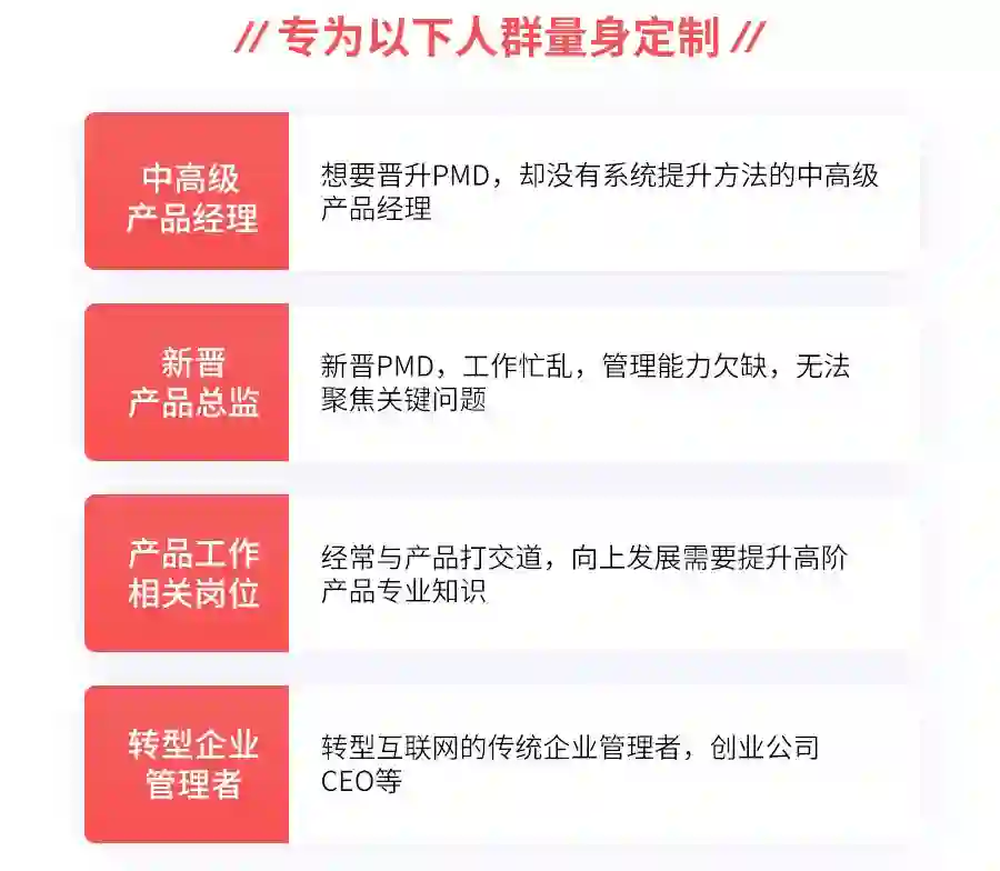 第三,适合人群:无论是中高级产品经理、还是新晋产品总监,都需要掌握高阶产品的核心能力框架,站在行业战略的高度去统筹产品规划,以及用研、产品运营、数据等业务问题。