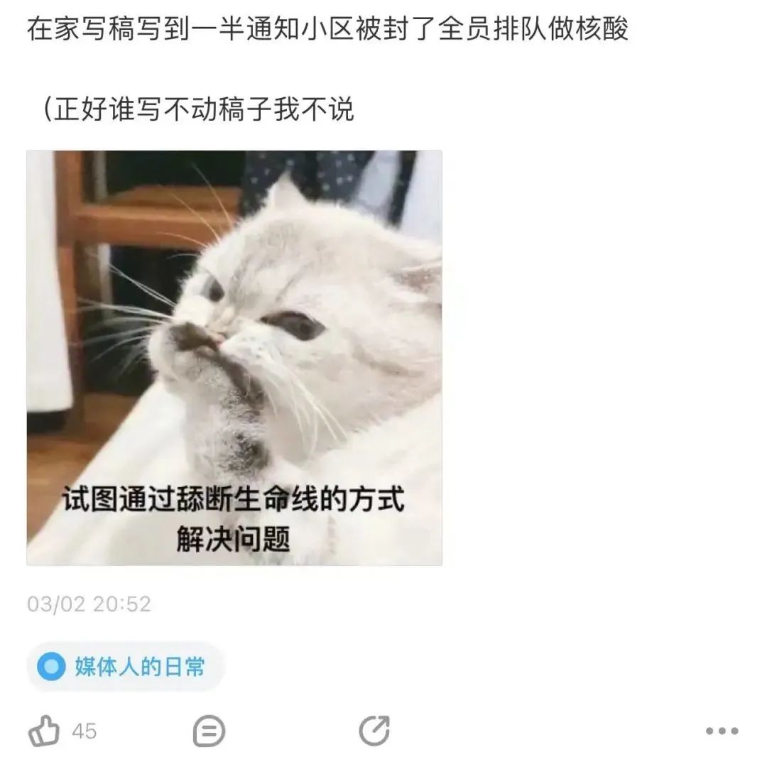 3月2号晚上,小区接到全员核酸通知,当时我正好在赶稿,随手发了一条即刻动态,获得了至今为止最高的点赞量,看来新媒体人都懂赶稿的痛苦吧。