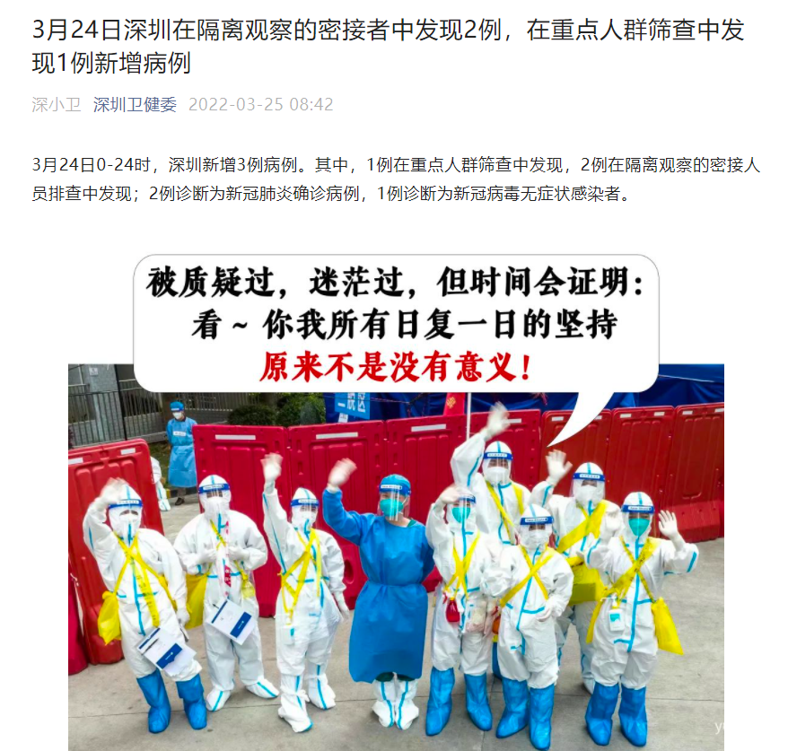 3月25日,公众号“深圳卫健委”公布前一天病例情况后,配上了一群“大白”向镜头挥舞手臂的照片,仿佛在告诉大家这场战役已经接近尾声。
