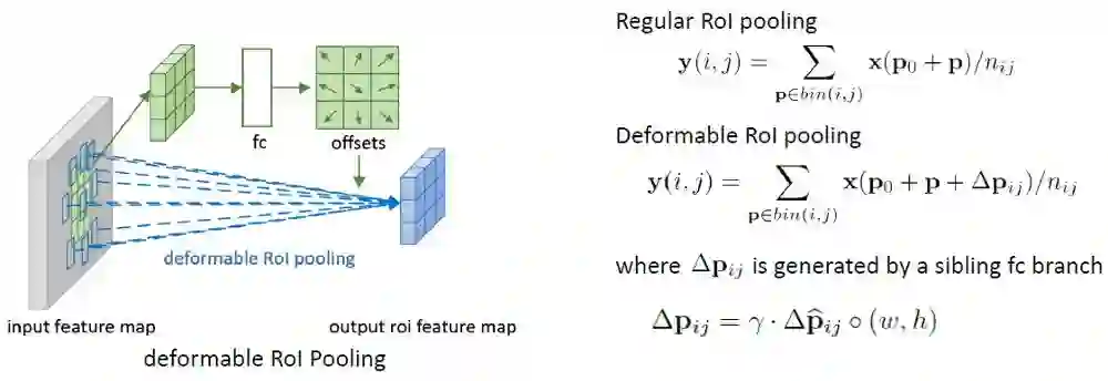 最后,在底部路径,我们执行deformable RoI pooling。输出特征图是基于具有增强偏移量的区域进行池化的