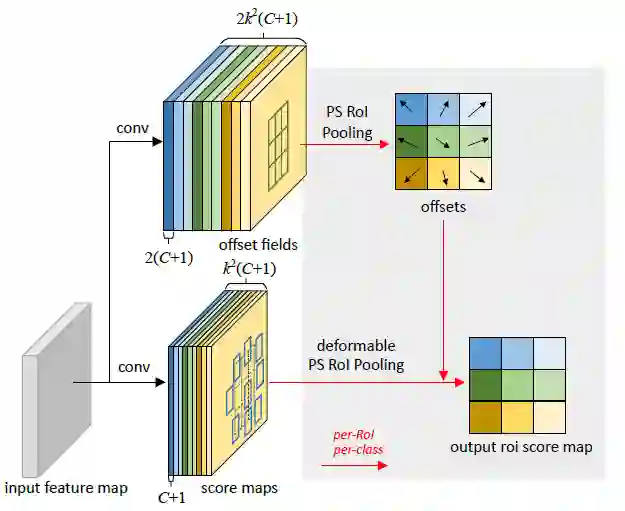偏移量(顶部路径)的原始的PS RoI Pooling是使用图中相同的区域和相同的颜色来池化的。我们在这里得到偏移量。