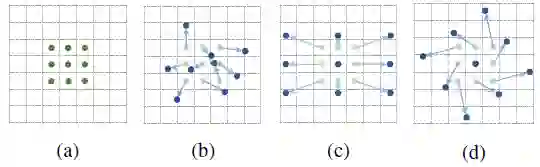 (a) Conventional Convolution, (b) Deformable Convolution, (c) Special Case of Deformable Convolution with Scaling, (d) Special Case of Deformable Convolution with Rotation