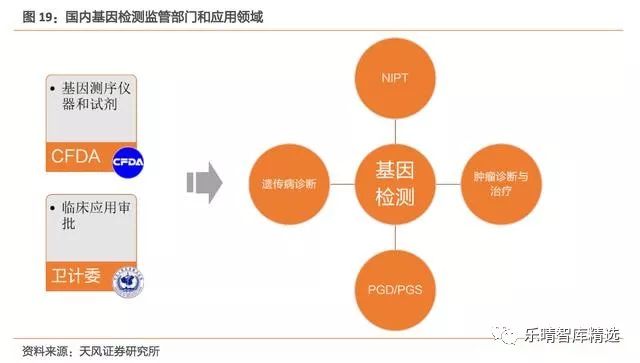 基因检测临床应用主要集中在四个领域,分别是产前筛查和产前诊断(NIPT)、遗传病诊断、肿瘤诊断与治疗、植入前胚胎遗传学诊断(PGD/PGS),第三方检测机构需要通过CFDA和卫计委的批准后才可开展相关工作。