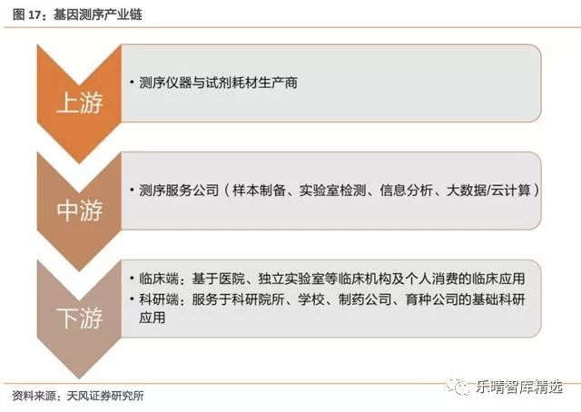 下游则分为两部分—科研和临床,测序技术首先是应用与科研端,后来逐步利用成熟流程切入临床端,目前的下游市场应用广泛,百花齐放。
