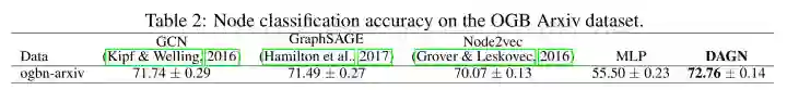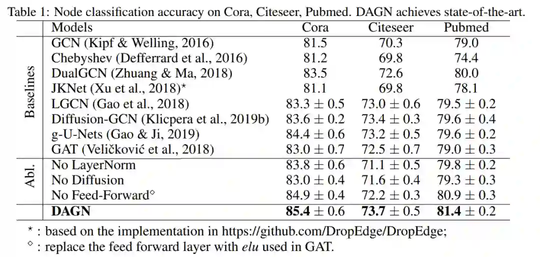 原文指出:DAGN = GAT + diffusion + layer normalization + residual connection,在Cora分类中,DAGN=85.4,GAT = 83,而DAGN - diffusion = 83 ,没有进行GAT+layer normalization 或 residual connection的实验