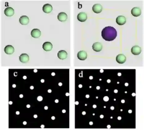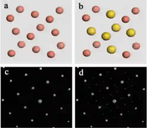 上图即是 CuAu3无序和有序的模型和对应的电子衍射花样。其中图 a 是 CuAu3无序时的晶体结构模型,而图 b 是有序时的晶体结构模型;图 c 是与无序对应的电子衍射花样,而图 d 则是与有序对应的超点阵电子衍射花样。