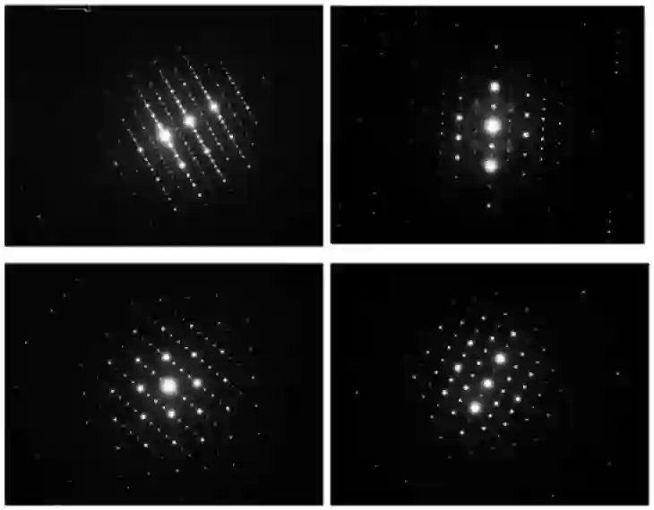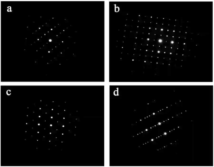 上图是超点阵花样的一些实例, 这些花样是从一种沿[111] 方向具有六倍周期的复杂有序钙钛矿相中得到的。 图 a 是沿[010] 方向 2 倍周期有序的超点阵电子衍射花样, 图 b 是沿[101] 方向 2 倍周期有序的超点阵电子衍射花样,图 c 是沿[11-1]方向 2 倍周期有序的超点阵电子衍射花样,而图 d 则是沿[111] 方向 6 倍周期有序的电子衍射花样。