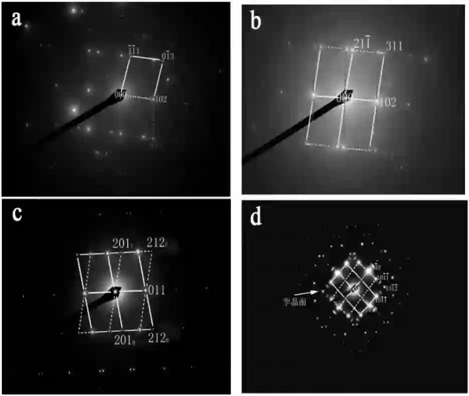 上图中图 a 和 b 是 CaMgSi相中的(102)孪晶在不同位向下的孪晶花样,图 c 是 CaMgSi相中另外一种孪晶的电子衍射花样,其孪晶面是 (011)面;图 d 是镁中常见的(10-12)孪晶花样。