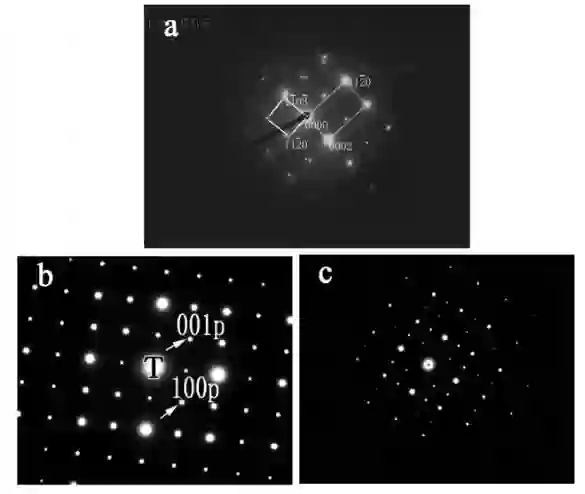 上图是 CaMgSi相中(102)孪晶中二重孪晶和三重孪晶的形貌和与其对应的电子衍射花样。图 a 是二重孪晶的形貌(暗场像),图 b 是与之对应的二重孪晶花样;图 c 是三重孪晶的形貌像(暗场),图 d 是与之对应的三重孪晶花样。