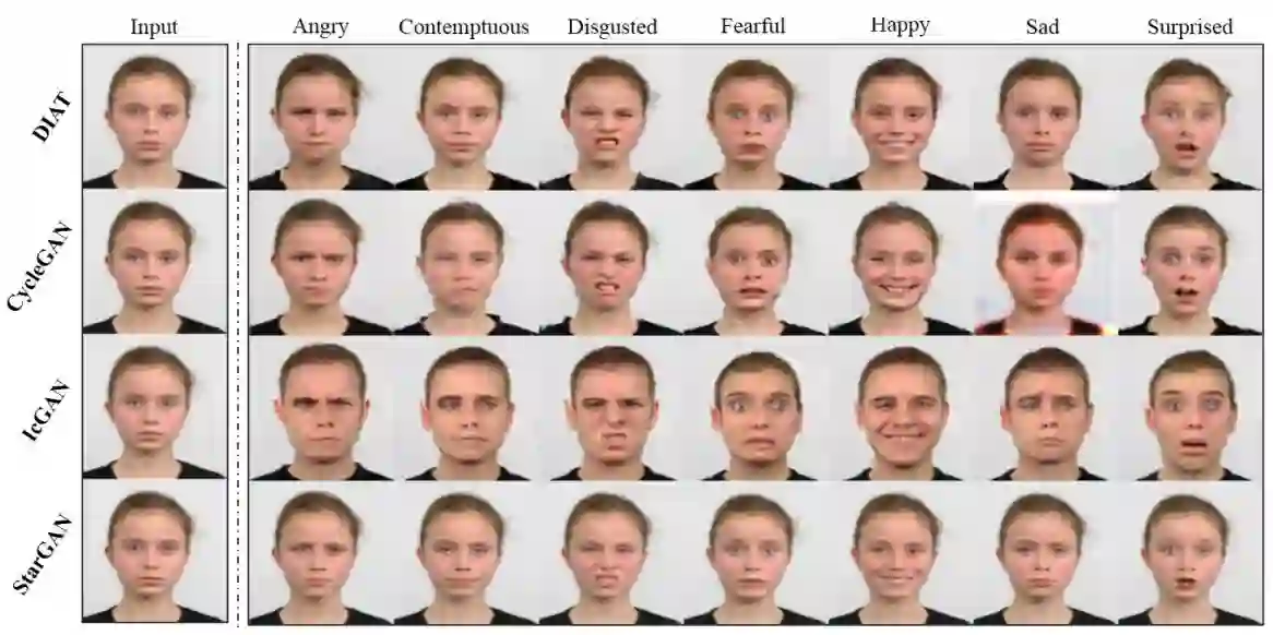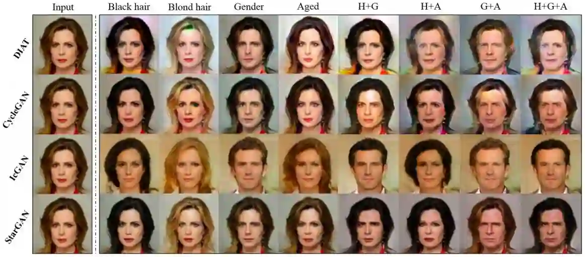 如上图所示,在所有参与实验的模型中,StarGAN训练的模型生成的图片最为清晰自然,它很好地保留了人脸的基础形象和面部特征。虽然DIAT、CycleGAN模型也保留了大部分脸部特点,但它们生成的图像都十分模糊。而IcGAN甚至无法保留原图像的基础信息,生成了一些男性图像。