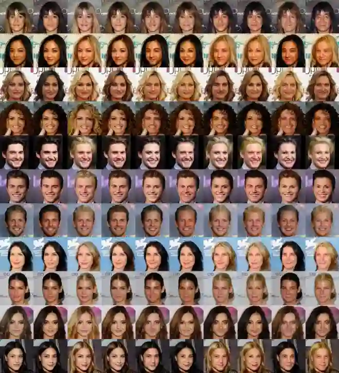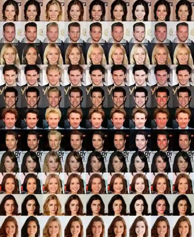 CelebA的全称是CelebFaces Attributes,它是香港中文大学汤晓鸥教授实验室公布的大型人脸识别数据集,包含202599张带注释的人脸图像及40余种人脸属性。研究人员将图片尺寸由178×218调整至128×128,并构建了7个域:头发颜色(黑色/金色/棕色)、性别(男/女)和年龄(年轻/年迈)。