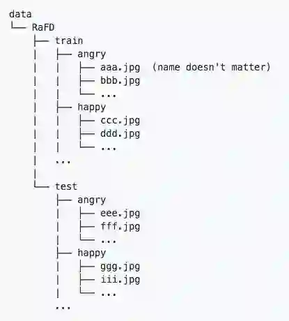 RaFD全称Radboud Faces Database,是一个包含有4824张图片的数据集,它内部可分为67类(包括高加索地区男性、女性、儿童及摩洛哥男性等),每一类都包含从3个角度捕捉到的8种面部表情。研究人员也对图像做了调整,他们从原图中截取了大小为256 × 256的脸部特写,将尺寸调整为128×128,并从中抽取10%的图像作为测试集,保留剩下的90%为训练集。