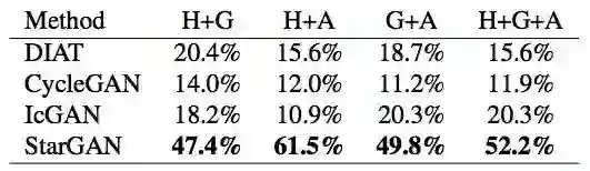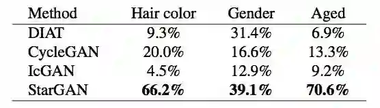 为了凸显StarGAN的效果,研究人员设置了3个对照组:DIAT、CycleGAN和IcGAN。前两者都是跨领域模型,可用来比较模型在执行单一或多属性传输任务时的表现。它们采用的方法是多步骤转换,如在更换头发颜色后再改变性别。