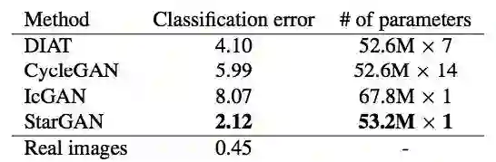 同时,和IcGAN相比,StarGAN模型生成的图像保留了更多面部特征,这可能是因为后者用卷积层激活地图来维护空间信息,并将之作为潜在信息,而前者则只是直接使用了一个低维潜在向量。