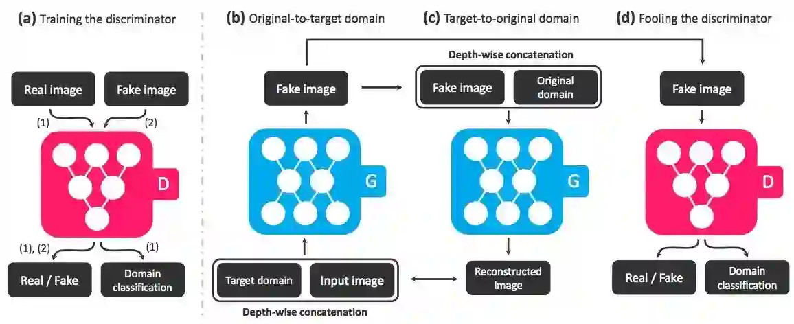 当一真一假两组图像数据集输入模型后,判定器D首先负责从中归类出它认为是“真的”的特征,并放进一个相应的域类(domain classification)(图a)。随后,研究人员将测试图片和目标域(希望转化的方向)输入模型,由生成器G结合两者信息生成一幅“虚假”图像,再将“虚假”图像结合目标域输入模型训练(图b)。接收到新的输入信息后,生成器G根据目标域信息尝试把“虚假”图像还原成原始图像,并将重建的新图输入前一个步骤(图c)。判定器D根据生成器G传来的“虚假”图像,试图从中分离出和真实图片难以区分的特征,并归类到D的目标域(图d)。