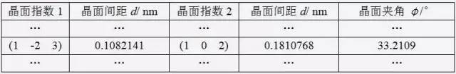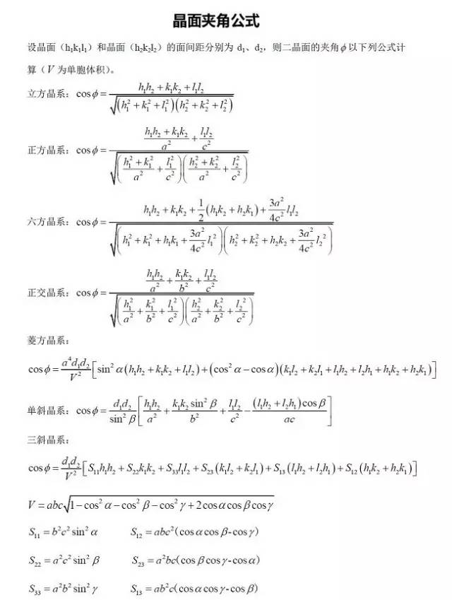 此后,将你挑选出来的指数代入公式进行晶面夹角计算(文末附有所有类型的晶体的晶面间距公式和晶面夹角公式)。