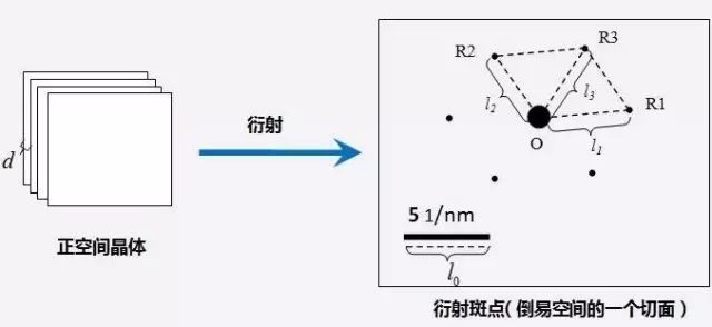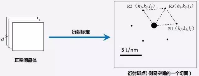 第一步虽然简单,但我们还是有必要详细说明一下晶面间距如何计算。现在我们手中只有一张衍射斑点图,图上有几个圆点,这些衍射斑点是晶体的倒易点阵。此外,还有一个标尺,标尺单位为1/nm(1/nm是倒空间的长度单位)。