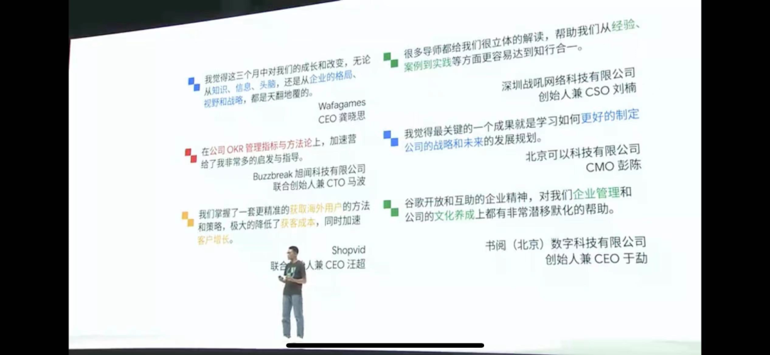 中国的创业和创新活力全球领先,光 2021 年就有 2600 万+企业诞生。为帮助中国出海创企打造“内功”,Google 推出了谷歌出海创业加速器项目,汇集了中国头部出海企业创业者、投资人、各领域专家及负责人,提供开源技术、市场、策略、团队建设等多方位支持。通过覆盖全球 29 亿用户的产品和平台,助力中国企业“0-1”出海,协作合作伙伴“1-100”在全球舞台绽放,至今也获得了许多企业的肯定。